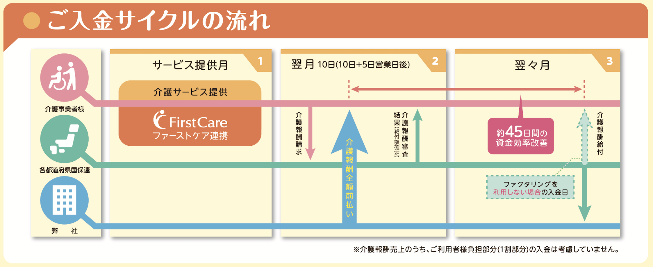 - ファクタリングを利用しない場合と比べ、介護給付費が45日程度早く受け取ることが可能です。